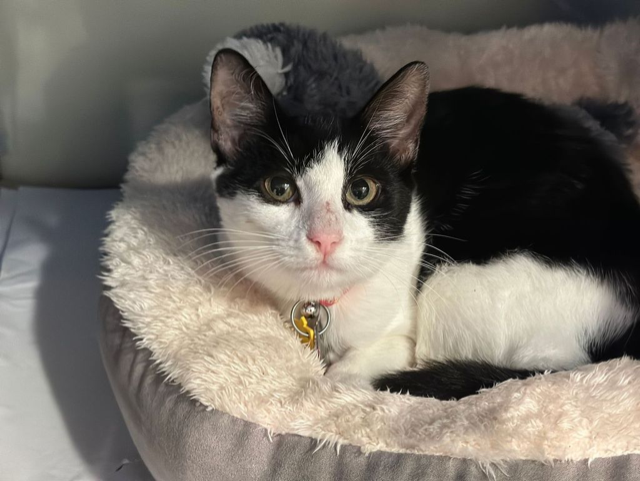 Nico is a very sweet kitten who is more on the mellow side. He enjoys playing with cat toys and romping around with his siblings. Nico has a very gentle side and needs lots of love. In his foster home, you will find Nico looking to lounge in the sun at the windowsill. He would make a great addition to any family.