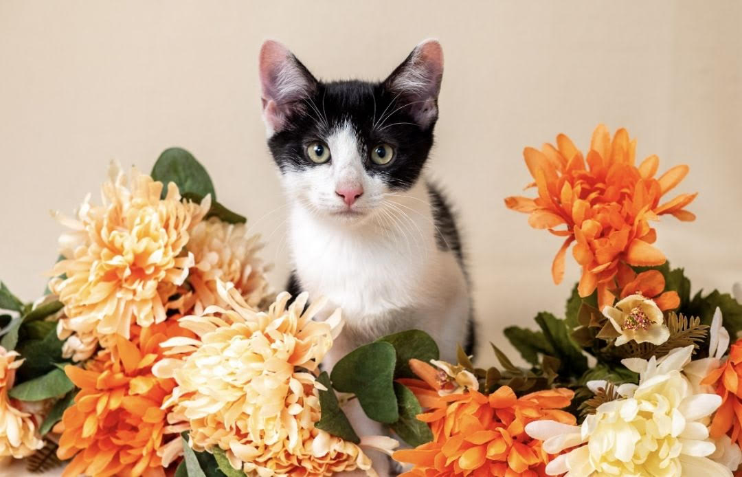 Grumpy has the cutest facial expressions. His black and white coat really shows off the white fluff in his ears. This endearing boy is mellow and can play independently or with other cats, showing a shy side some of the time, but that’s what makes him such a cutie patootie!