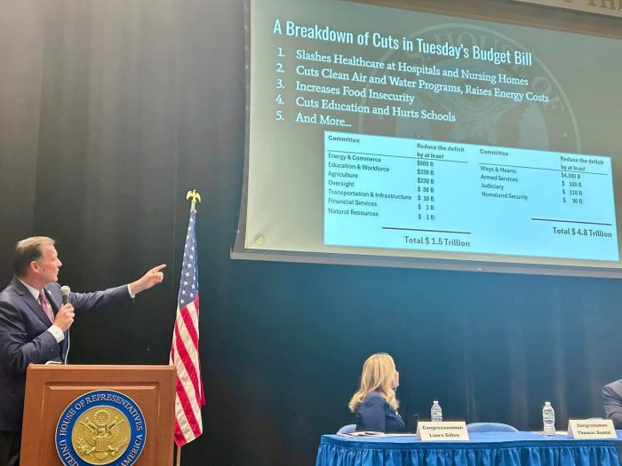 Over 700 people attended the members’ town hall, which outlined how proposed cuts to federal healthcare, tax credit, food assistance, and environmental programs like Medicaid, school lunches, and SNAP would impact Long Island.